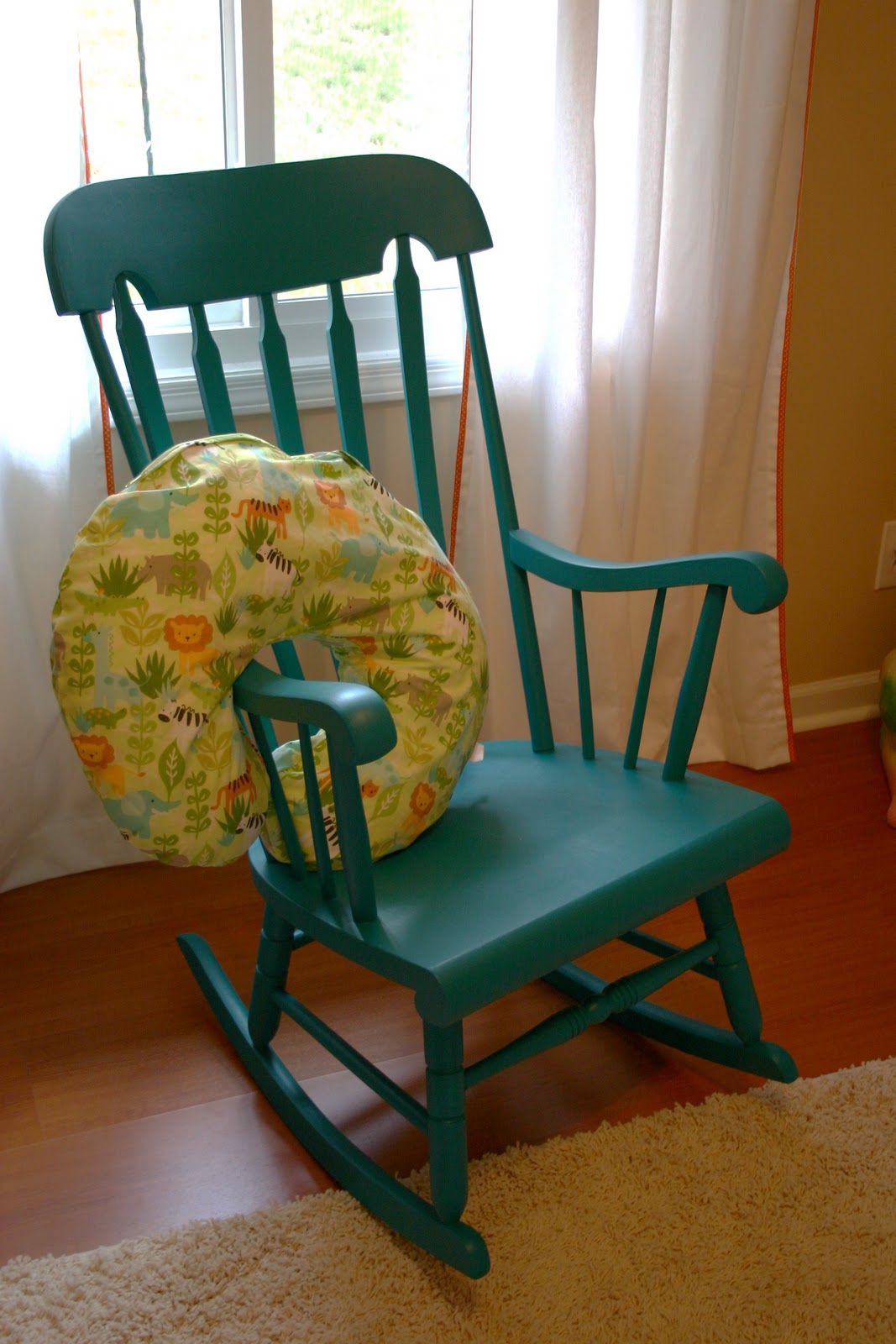 Early this year we inherited one of Kenon's grandmother's rocking chairs. I loved the vintage look to it but I knew I wanted it for Wren's nursery. So we scrubbed it down and painted it bright turquoise. I am thrilled with how it turned out. We had a large arm chair in his room but he seems to like the rocking motion of his new chair much better.